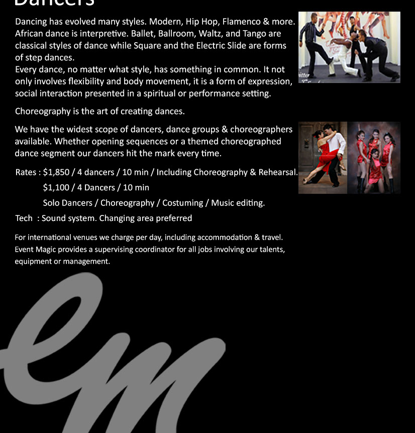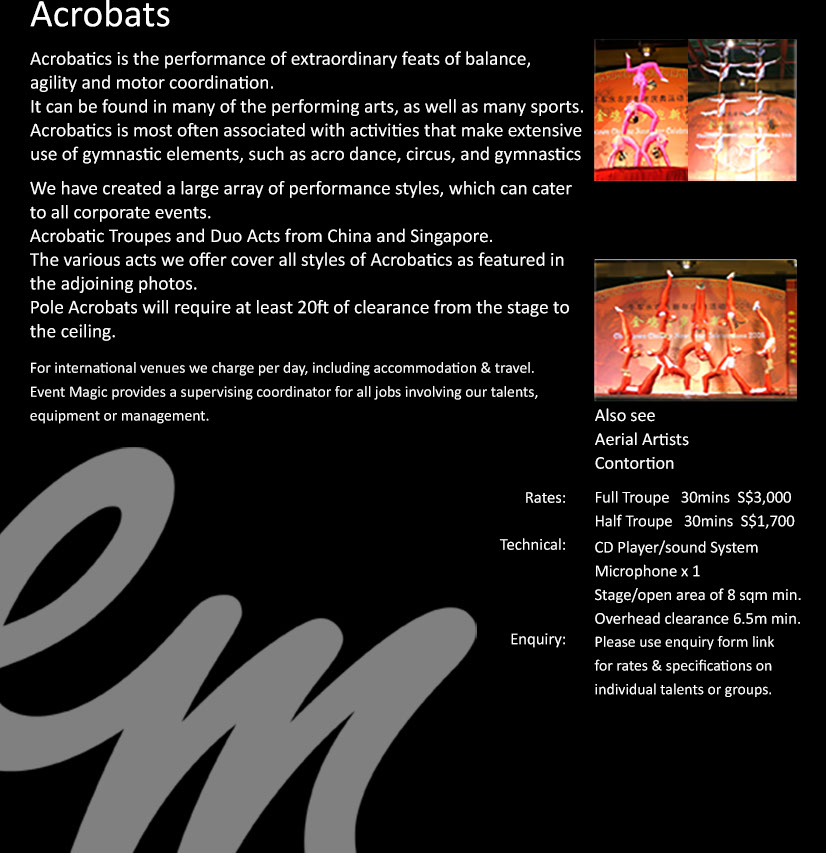 Stage acts for hire, Entertainment for hire, entertainer for hire, magician Singapore, circus Singapore, dancers for hire Singapore, Entertainment for hire, entertainer for hire, Event Magic is an international event and talent management firm based in Singapore. We specialize in talent management and event production that synergize with our clients